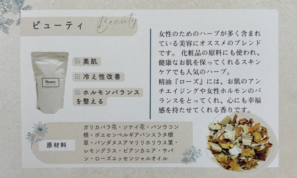 tanonでは、4種類のブレンドハーブをご用意しているのですが、すべて『日本ハーブテント協会』がおすすめするオーガニックなインドネシアンハーブを使用しています。今日はその中から、ビューティーブレンドに配合されている7種類のハーブ+エッセンシャルオイルの効能をそれぞれご紹介させていただきます。